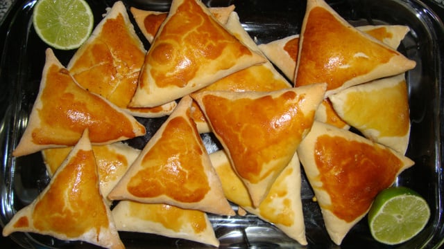 Abra as bolinhas com o rolo, coloque a mistura de recheio com uma colher e feche em forma de triângulo.