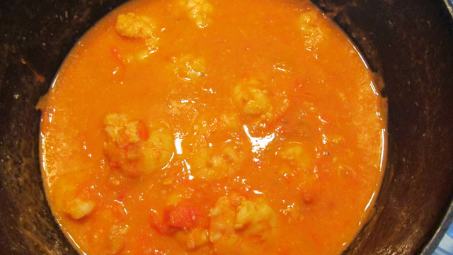 Quando o o óleo estiver quente, coloque os camarões e deixe dourar bem, junte os tomates formando um molho bem consistente.