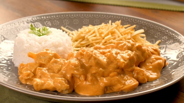 O strogonoff de frango é um prato amado por todos e muito fácil de ser preparado! A combinação da carne de frango suculenta com o molho cremoso deixa qualquer um salivando só de pensar. Criado originalmente na Rússia, a versão brasileira tem algumas diferenças bem particulares. Enquanto no país de origem a receita é feita apenas com carne bovina, o molho é muito mais ralo, pálido e feito com creme azedo, o nosso pode ser feito com frango, carne ou camarão, tem molho mais encorpado, feito com creme de leite, e com molho de tomate ou ketchup para dar cor e sabor ao molho. Além disso, versão brasileira é servida com batata palha, para dar crocância, ou com batata frita, enquanto a versão russa. Para completar o prato, o arroz branco ou integral soltinho é perfeito. Que tal aprender como fazer essa delícia aí na sua casa? Essa receita de strogonoff de frango é tão simples que vai te surpreender!
