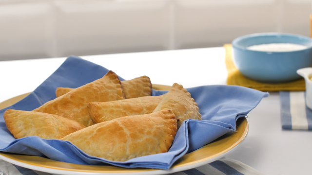 Abra a massa com o rolo em uma superfície plana e enfarinhada, corte-a em 20 pedaços, distribua o recheio, feche os pastéis e pincele com a gema.