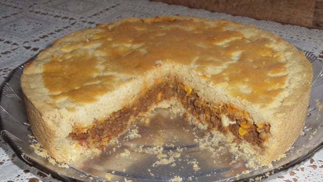 Forre uma forma refratária redonda ou retangular grande com uma parte da massa, coloque o recheio reservado já frio e cubra com o restante da massa.