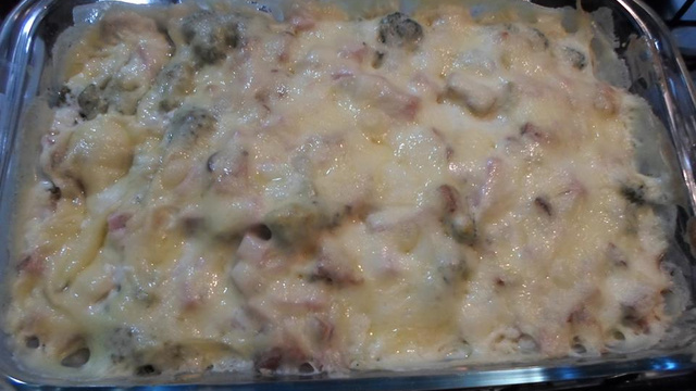 Agora é só montar o prato: brócolis cozido num refratário, molho branco por cima (metade), bacon fritinho em pedacinhos por cima do molho, restante do molho branco e para finalizar a mussarela.