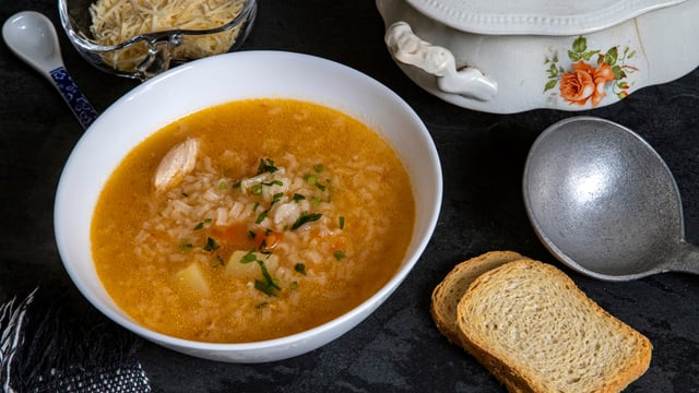 Após o cozimento de ambos junte a água, o arroz, o orégano, o queijo e o caldo de costela.