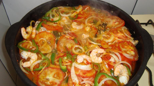 Na hora de levar ao fogo para cozinhar, despeje um pouco deste caldo por cima da moqueca.