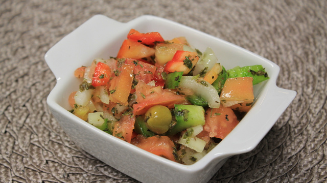 Corte os tomates em pequenos cubos, corte a cebola em pedaços pequenos,corte o tempero verde bem batidinho, acrescente o sal e por último o segredo, a colher de açúcar.