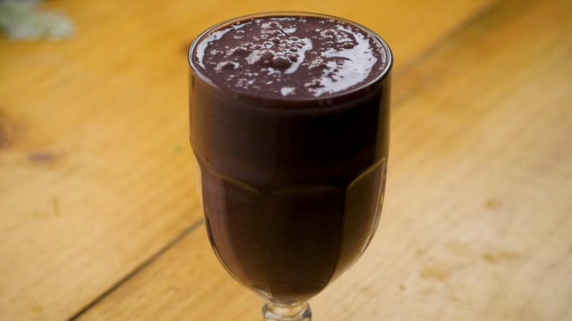 Bata no liquidificador a polpa de açaí, a banana picada, os morangos e a xícara de mel.