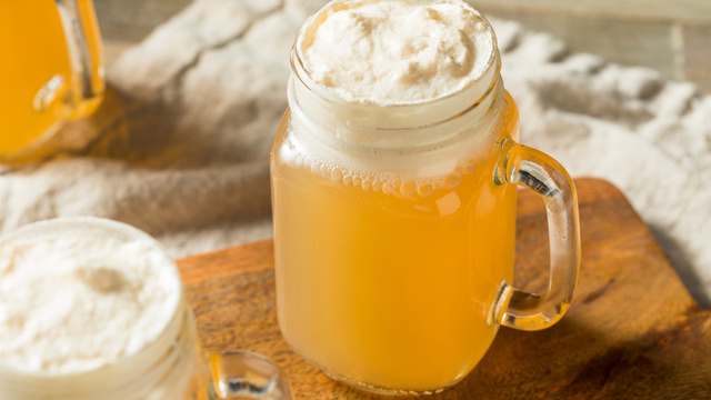 Em um copo, coloque a água com gás e adicione 4 colheres do caldo esfriado. Misture tudo.