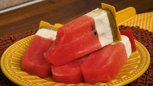 Retire os picolés e coloque a mistura de iogurte por cima da mistura de melancia.