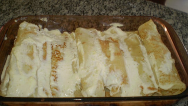 Recheie a panqueca com 1 fatia de mussarela e com o recheio.