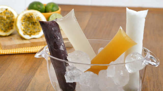 Para todos os sacolés, bata os ingredientes no liquidificador.