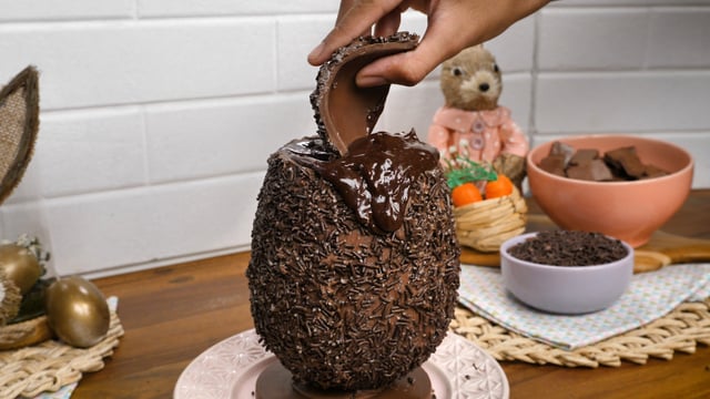 Como essa receita de ovo de Páscoa de pote é feita para ficar em pé, use um suporte para isso, seja uma base de chocolate ou uma base de plástico feita para isso. Para cortar o topo do ovo sem quebrar, a dica é esquentar a faca antes para amolecer o chocolate.