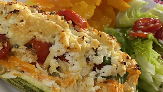Adicione o recheio nas duas metades da abobrinha, pique rodinhas de tomate cereja e cubra com o queijo.