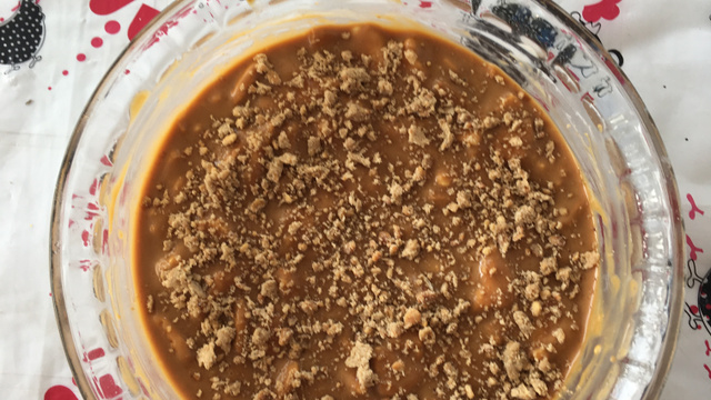 Quebre os biscoitos (com a mão mesmo) em pedacinhos e misture com o creme.