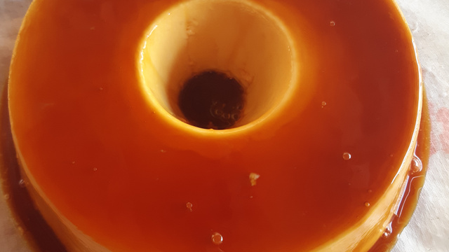 Depois passe para a forma de pudim com uma colher, passe o caramelo no meio e nas laterais.