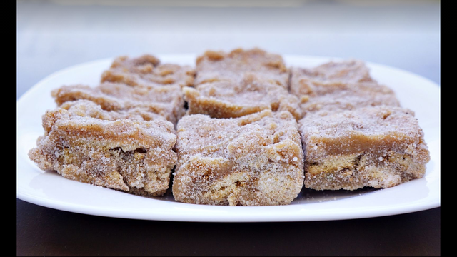 Retire da geladeira corte e depois é só empanar com o açúcar e canela.