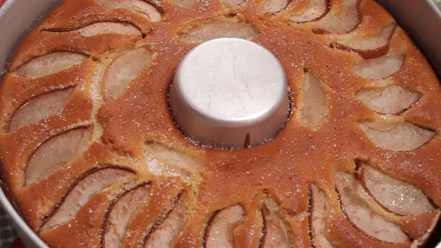 Obs: as fatias de pera são colocadas por cima na hora de levar para assar. Se quiser pode usar uma geleia de pera, pêssego ou outra da sua preferência só para pincelar depois de assado. Bon appétit