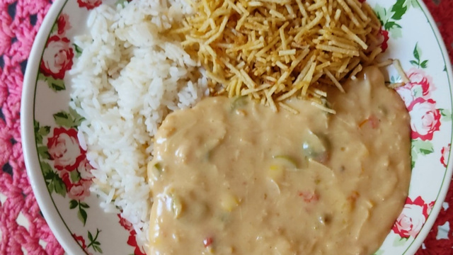 Quando engrossar, coloque os outros ingredientes (milho, ervilha, azeitona, leite de coco, menos o creme de leite)