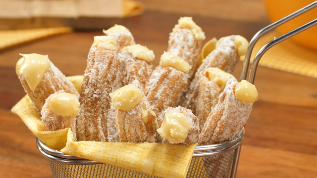 Frite os churros em óleo aquecido de 80°C a 180°C.