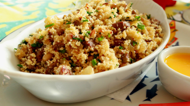 Adicione o ovo picado, a uva-passa e a azeitona picada.