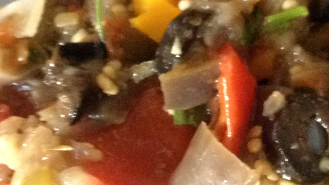 Acrescente, pela ordem, as beringelas, os pimentões, os tomates, o alho e a cebola.