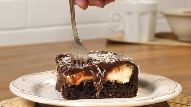 Espalhe a ganache por toda a superfície do bolo e salpique o coco e o chocolate por cima