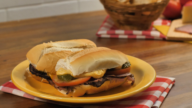 Coloque imediatamente na metade do pão sem miolo e feche com a outra metade com o rosbife.