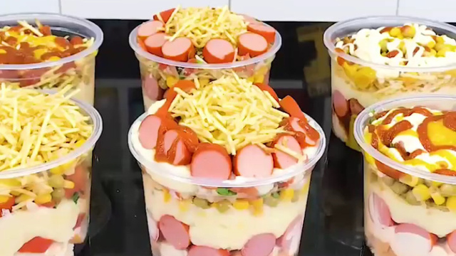 De seguida a cebola frita, o milho, o tomate (em bocadinhos), alface (também em bocadinhos), cenoura ralada ou o que preferir