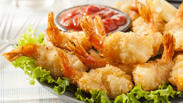 Logo em seguida afogue o camarão um por um no leite e na farinha de trigo mais uma vez ao leite e por último na farinha de rosca