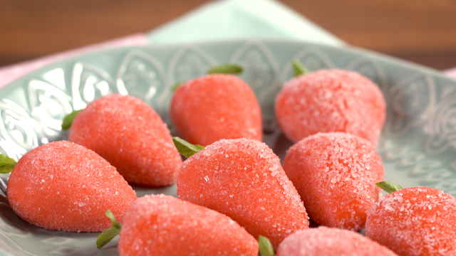 Enrole no formato de um morango, passe no açúcar cristal e decore com as folhinhas de manjericão.