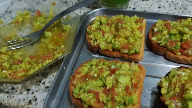 Depois, numa assadeira, coloque as torradas e cubra com a guacamole e em seguida com a mussarela