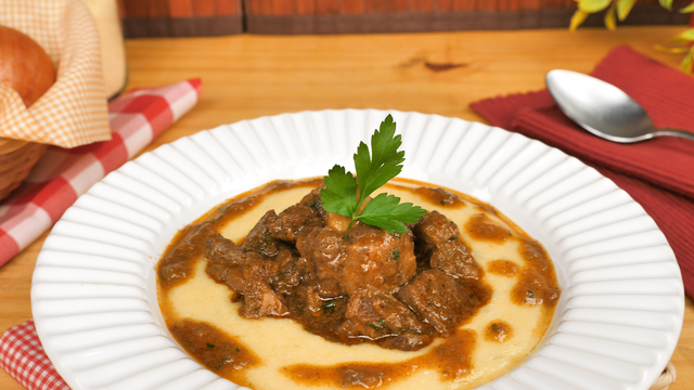 Abra a panela de pressão e sirva a carne por cima do angu.