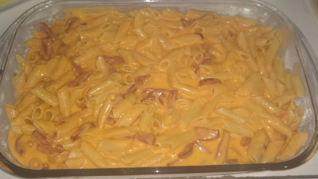 Em uma refratária misture o molho e o macarrão e sirva.