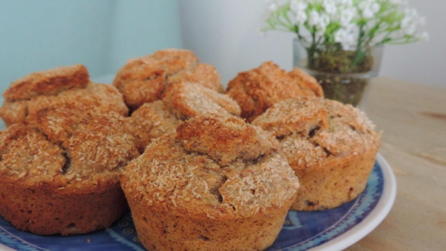Amasse as bananas, coloque os ovos e misture em seguida, coloque a farrinha de aveia e chocolate em pó, mistura bem, coloque o óleo de coco e para finalizar o fermento em pó.