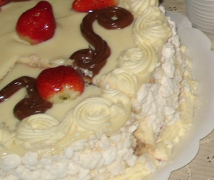 Para a cobertura, bater na batedeira os ingredientes e por cima colocar as raspa de chocolate branco.