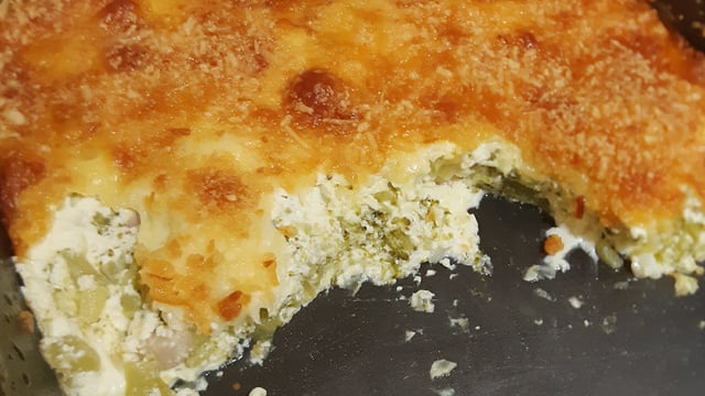 Depois coloque a mistura do bacon com o brócolis em cima, em seguida salpique o queijo mussarela ralado e por final salpique o queijo parmesão ralado.