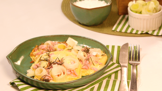 Recheie com mussarela, alho poró e presunto.