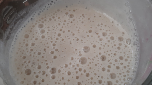 Bata primeiro a água com a farinha de trigo, veja se ficou próximo a consistência do leite.