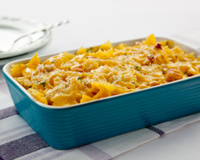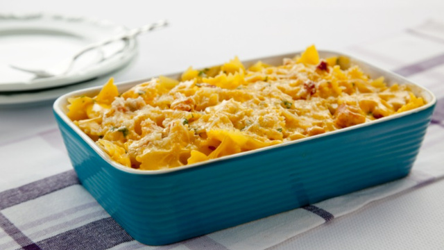 Em um refratário coloque o macarrão, o molho, o bacon frito e misture bem.