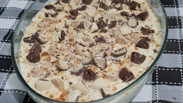 Intercale camadas de creme, bolacha maisena mergulhada no leite e paçoca esfarelada