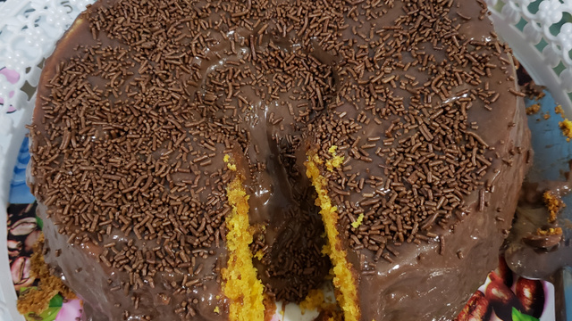 Desenforme o bolo e coloque a cobertura por cima junto com o granulado de chocolate para decorar.