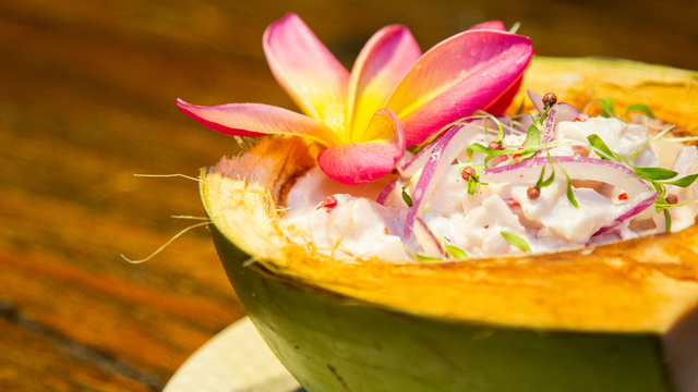 Pique a polpa do coco em pedaços grandes. Junte com o pimentão e a pimenta cambuci. Depois, misture com o gengibre e a cebola roxa escorrida.