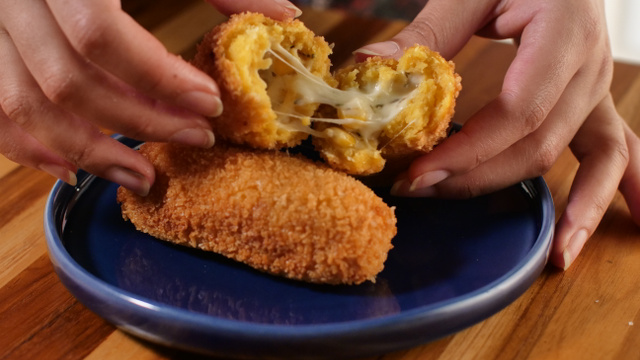 Abra uma pequena porção da massa na palma da mão, coloque o recheio e feche modelando um palitinho.