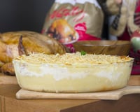 Frite o bacon em uma frigideira anti-aderente até dourar. Em uma travessa, faça a seguinte montagem: metade do purê, queijo ralado, bacon, mais purê, requeijão e batata palha.