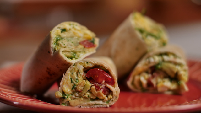 Abra a tortilha, passe a maionese de alho, coloque o ovo e finalize com o abacate e os tomates
