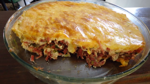 Misture a carne seca desfiada com a salsinha e a cebola frita.