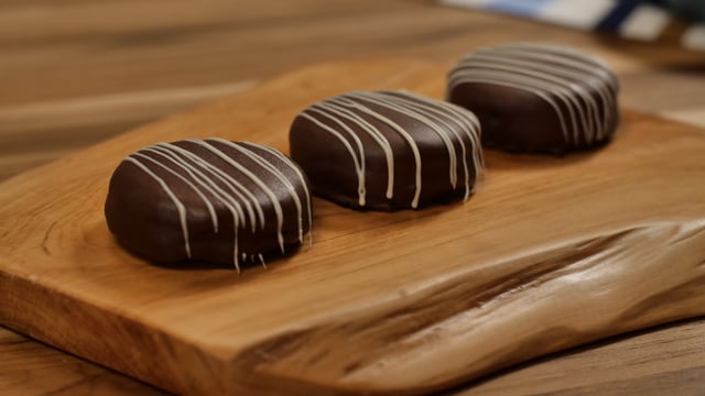 Depois, recheie os biscoitos com o brigadeiro, passe no chocolate meio amargo derretido e espere firmar