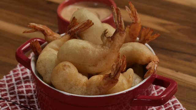 Passe os camarões com cuidado nessa massa e leve para fritar