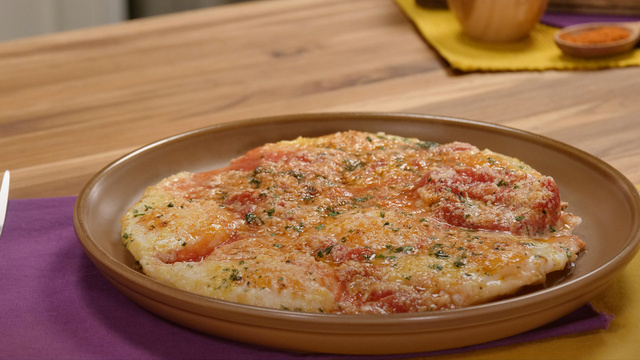 Em uma frigideira, adicione a manteiga, os ovos sem estourar, o tomate, o parmesão