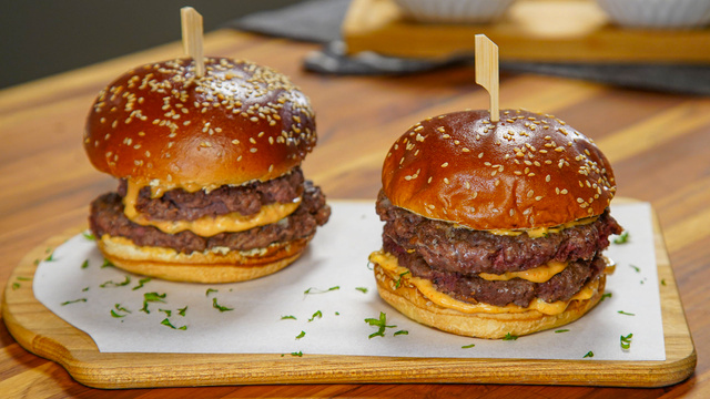Comece com a fatia de baixo do pão, adicione o molho, uma fatia de hambúrguer, mais um pouco de molho, outra fatia de hambúrguer.