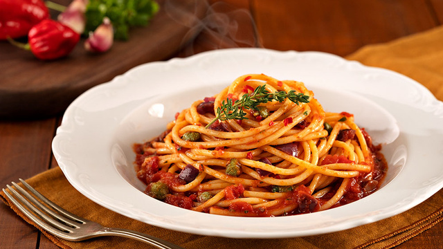 Em uma travessa, despeje o molho por cima da massa e acrescente as alcaparras e a salsinha picada ou outra erva fresca, como tomilho.